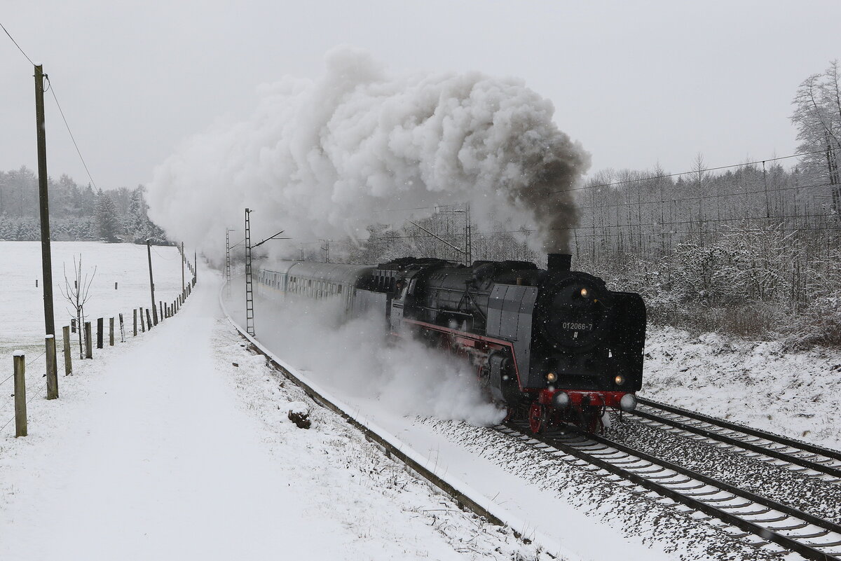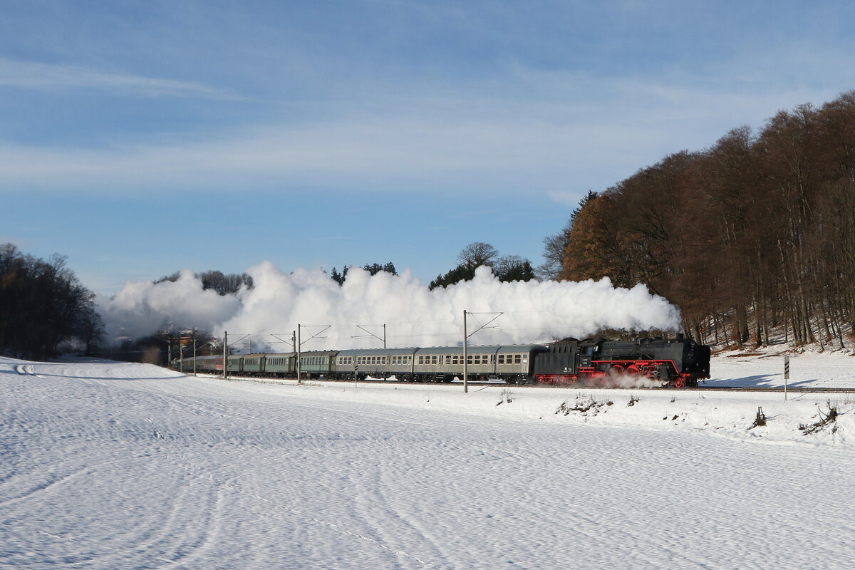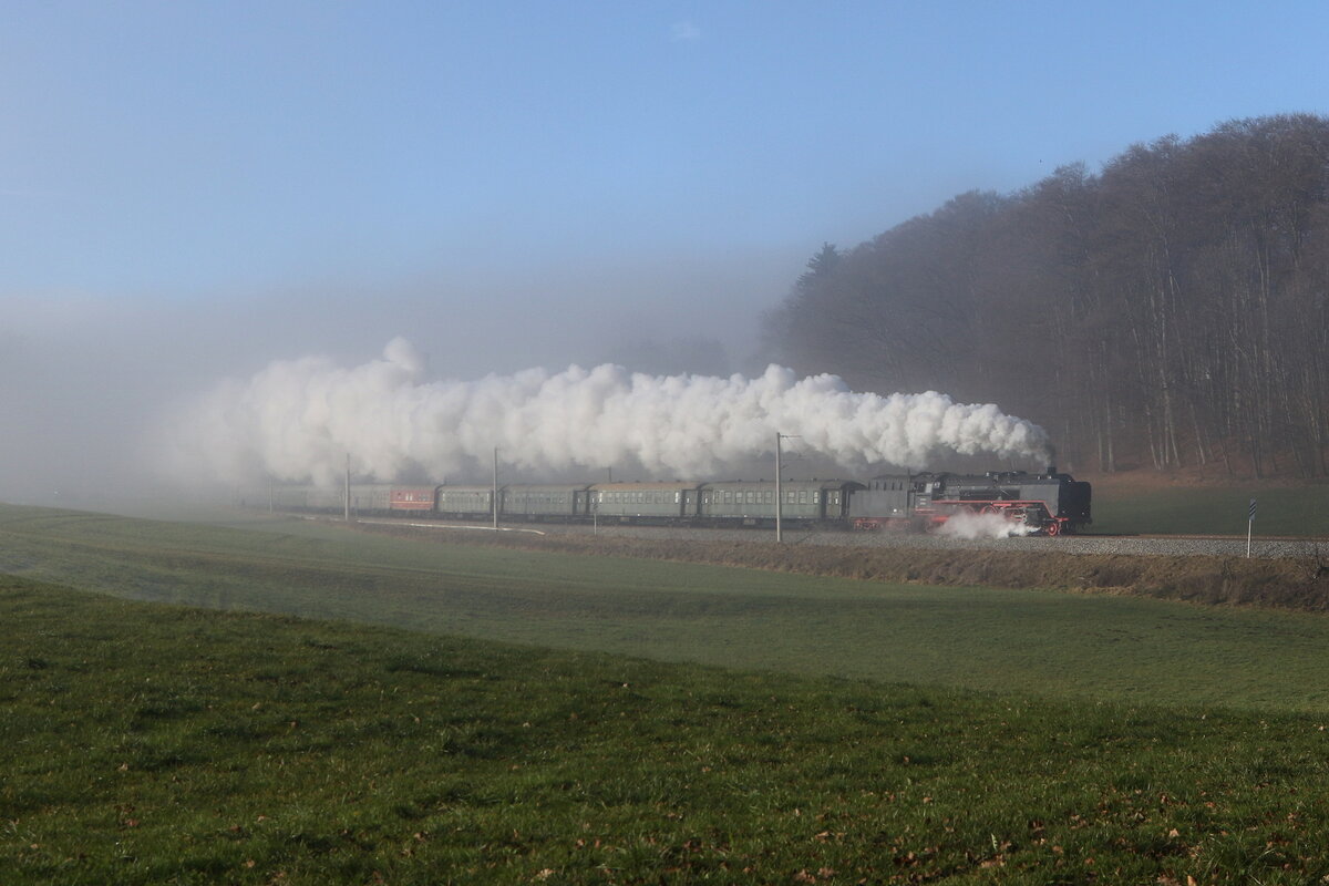 001 180 des "Bayerischen Eisenbahn-Museum" aus Nördlingen war am 30. November 2024 bei Hufschlag in Richtung Freilassing unterwegs.