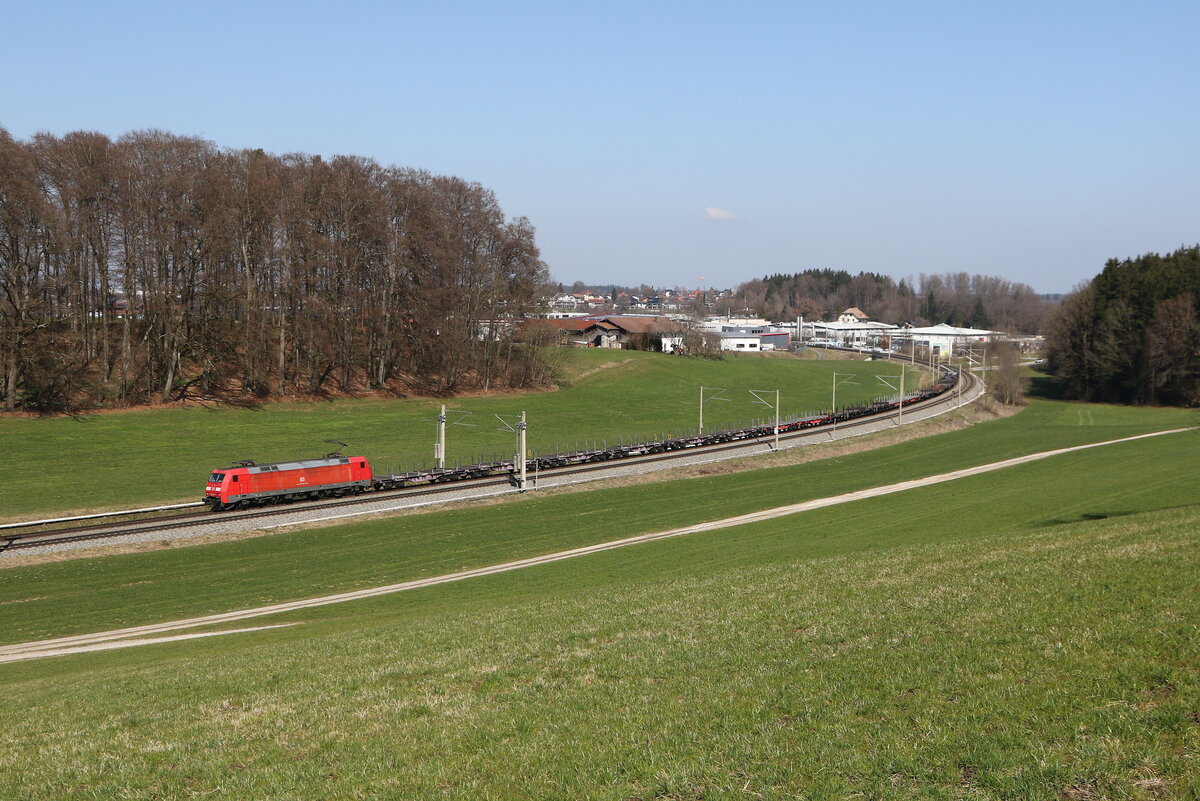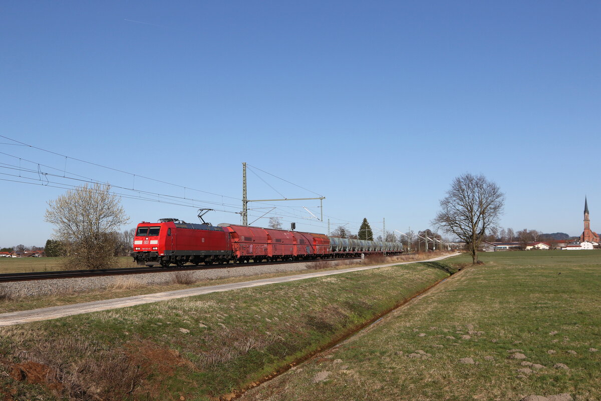 185 348-0 ist mit einem Kesselzug am 20. März 2014 bei Großsierning unterwegs.