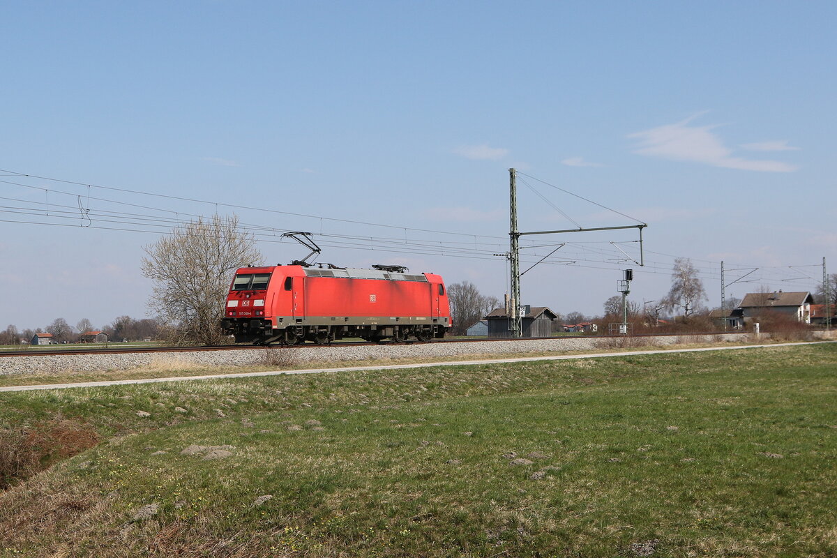 185 312-6 mit dem "Aicher-Zug" am 12. April 2015 bei Bernau am Chiemsee.
