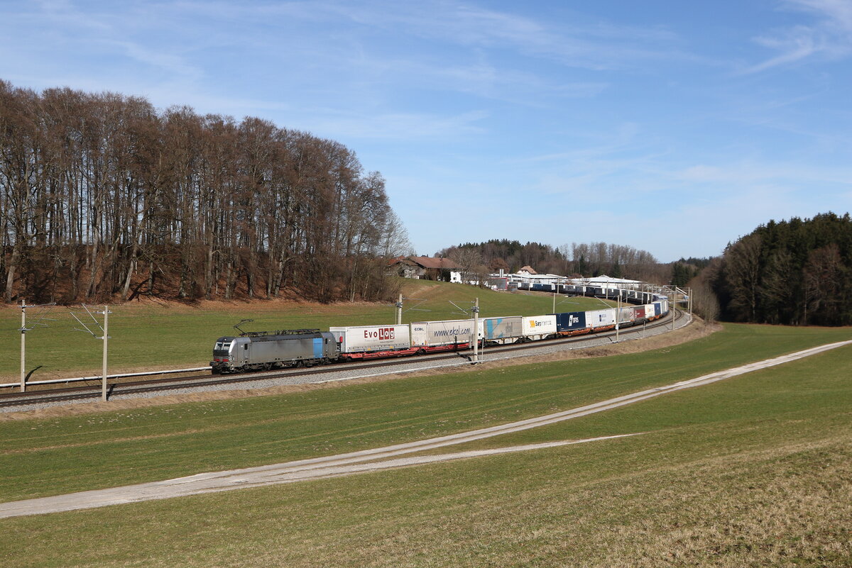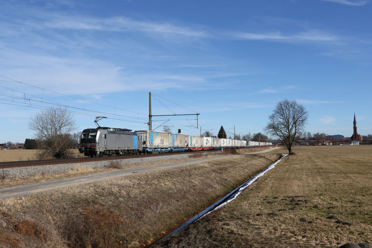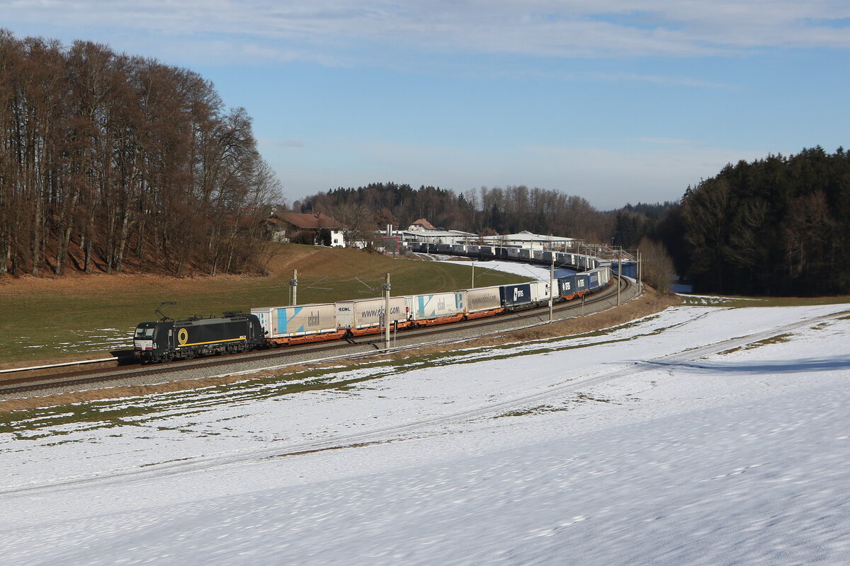 193 119 war mit einem "EKOL-KLV" am 18. Februar 2024 bei Axdorf in Richtung München unterwegs.
