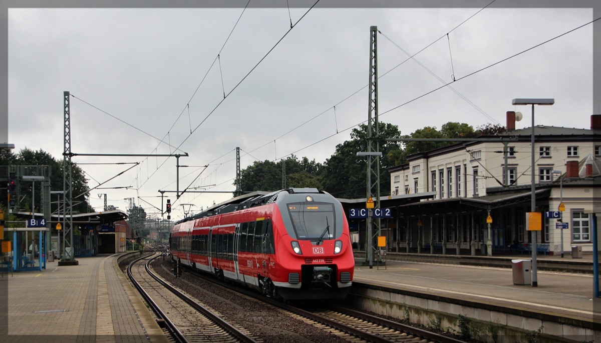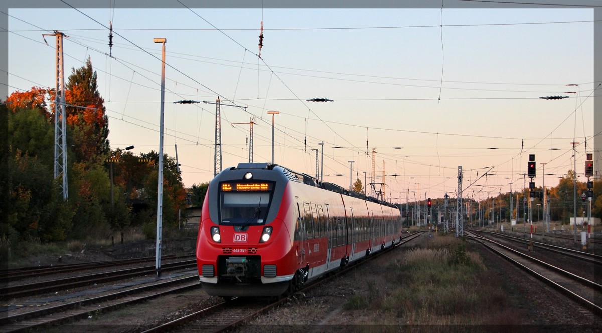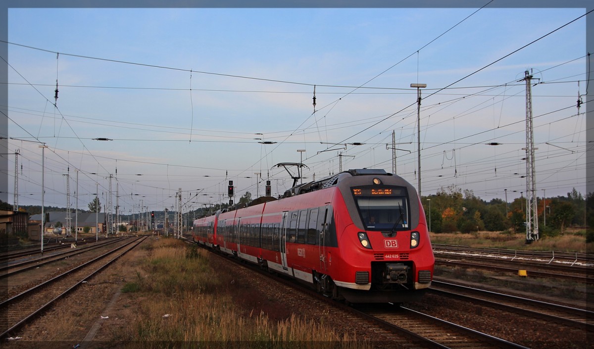 285 119 bei ihrer Pause im Neubrandenburger Gbf und der 442 345 bei der Ausfahrt in Richtung Neustrelitz Hbf am 27.04.2015