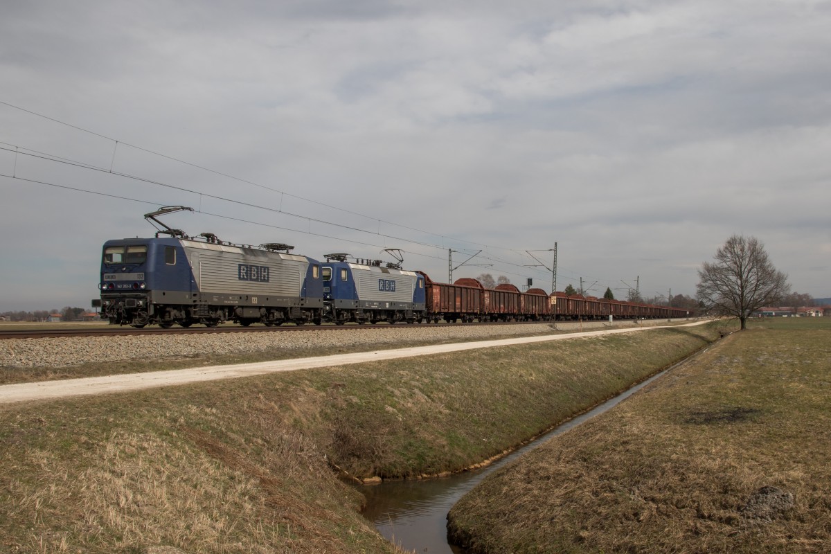 145 027 mit einem Containerzug am 6. August 2022 bei Himmelstadt am Main.