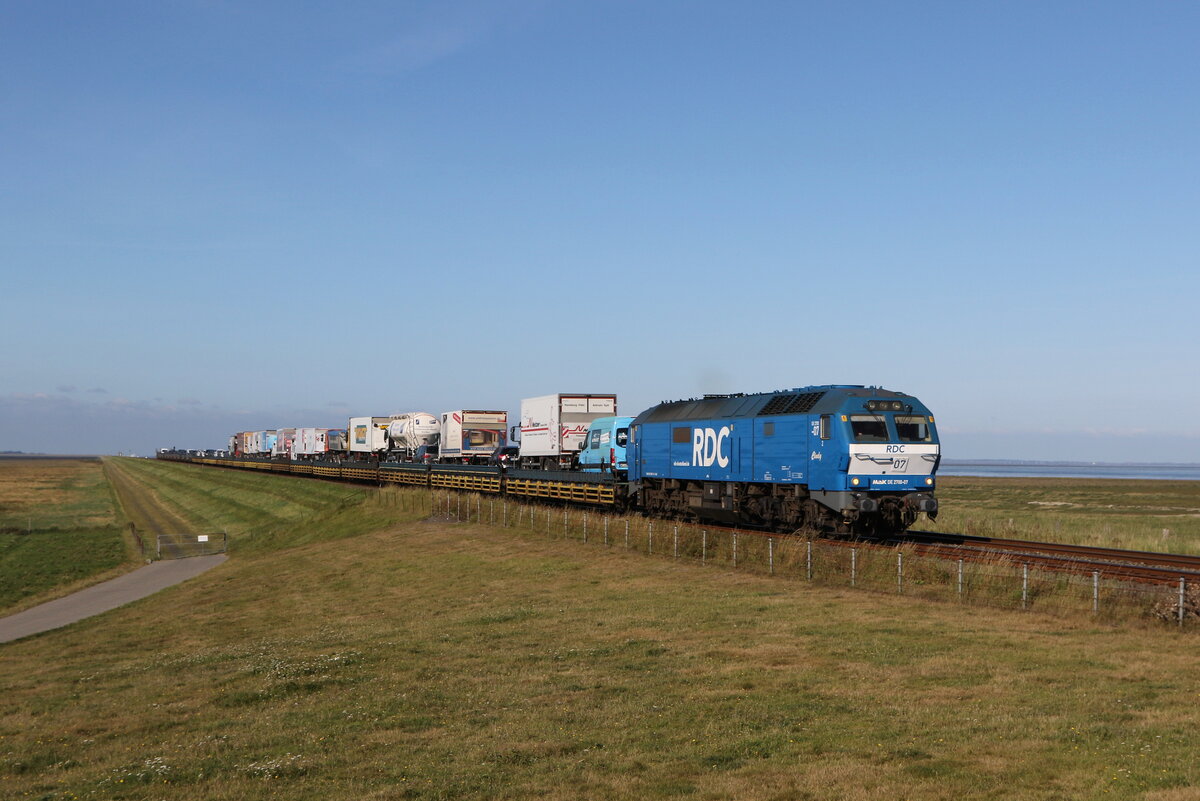 MAK DE 2700-02 mit einem Autozug am 14. August 2017 auf dem Hindenburgdamm.