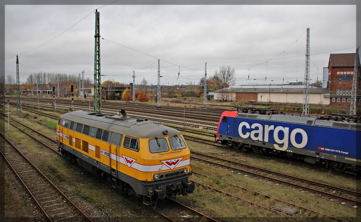 Die 216 012 (Lok 11) und die 216 122 (Lok 10) von Wiebe abgestellt in Möllenhagen am 22.05.2015