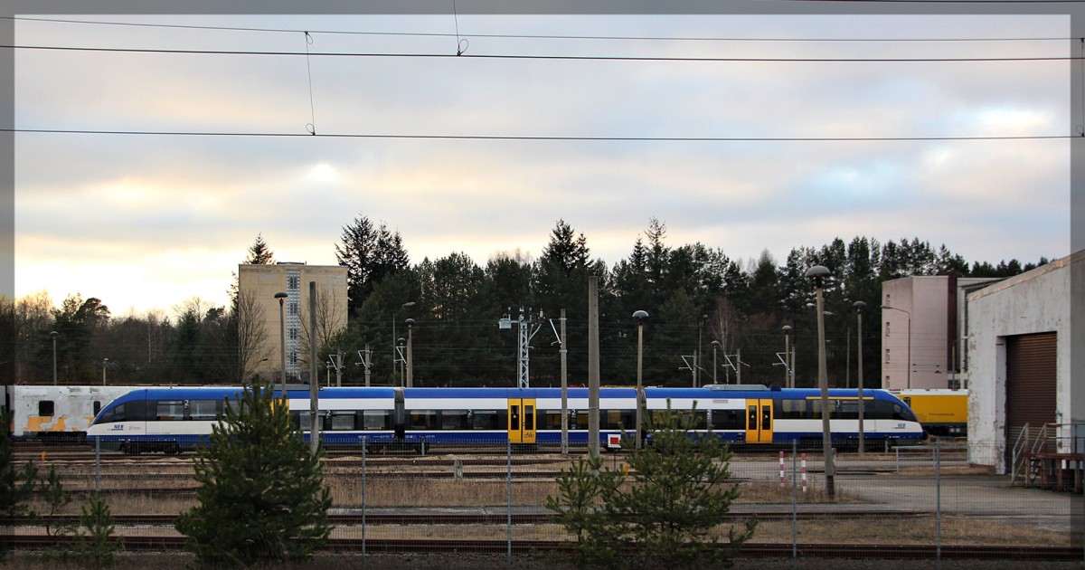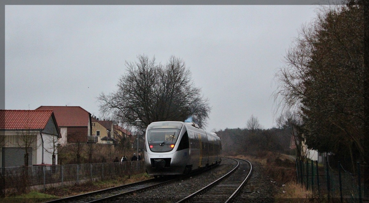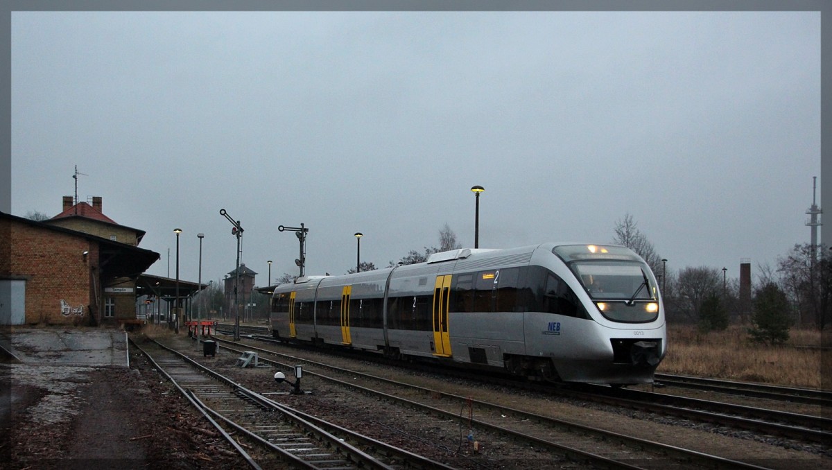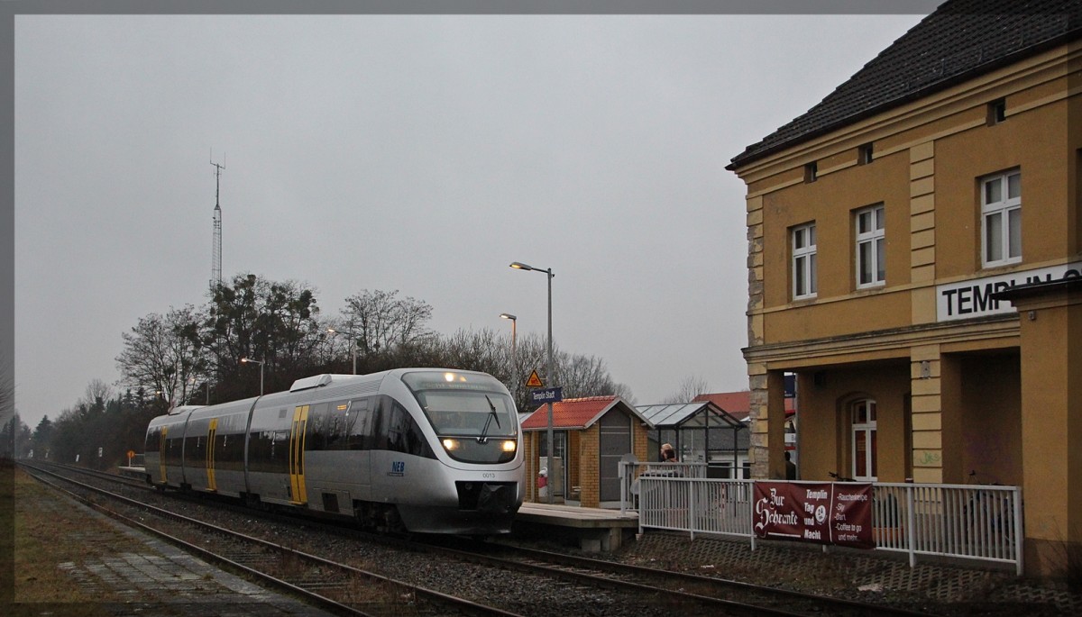 Der VT 0009 bei der Einfahrt in Neubrandenburg am 26.3.2012 neben der 232 285.