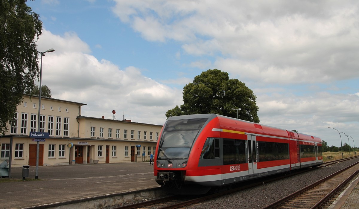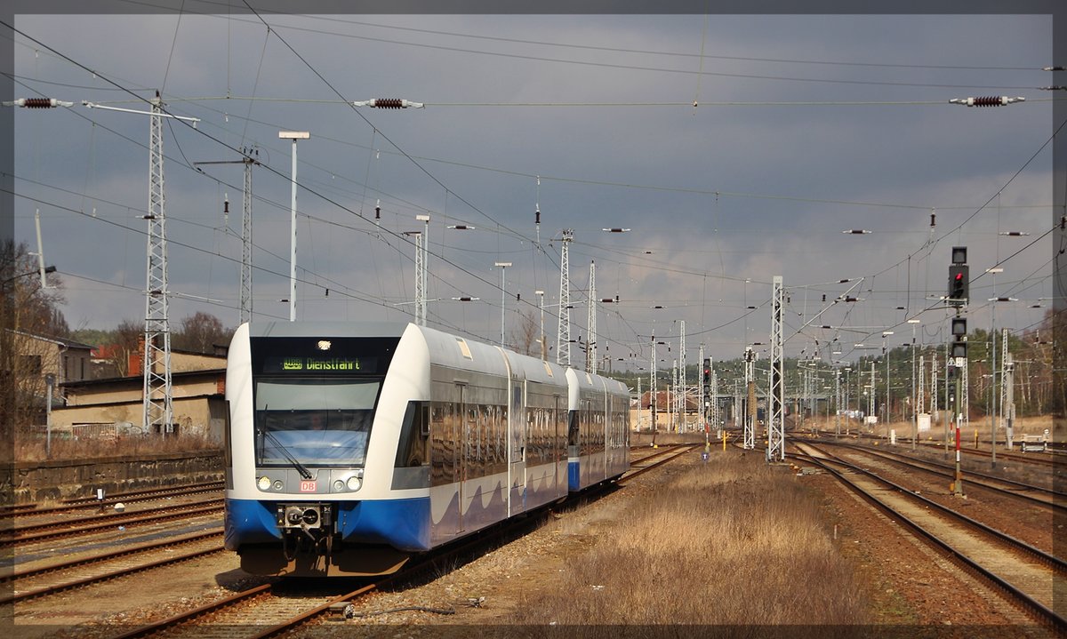 646 040 der ODEG wartet im Bahnhof Stendal am 26.02.2016