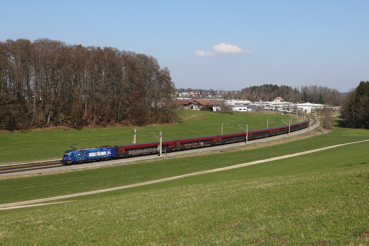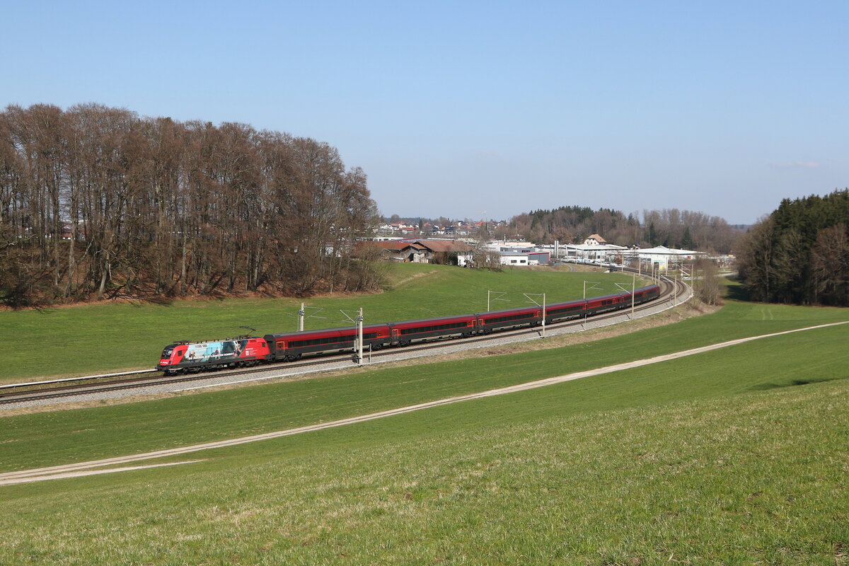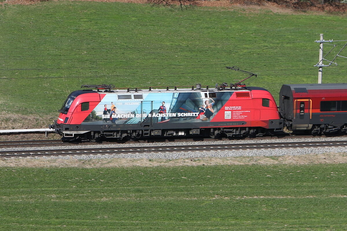 1116 182 der "Cobra"-Stier ist am 3. Mai 2015 bei Übersee in Richtung Salzburg unterwegs.