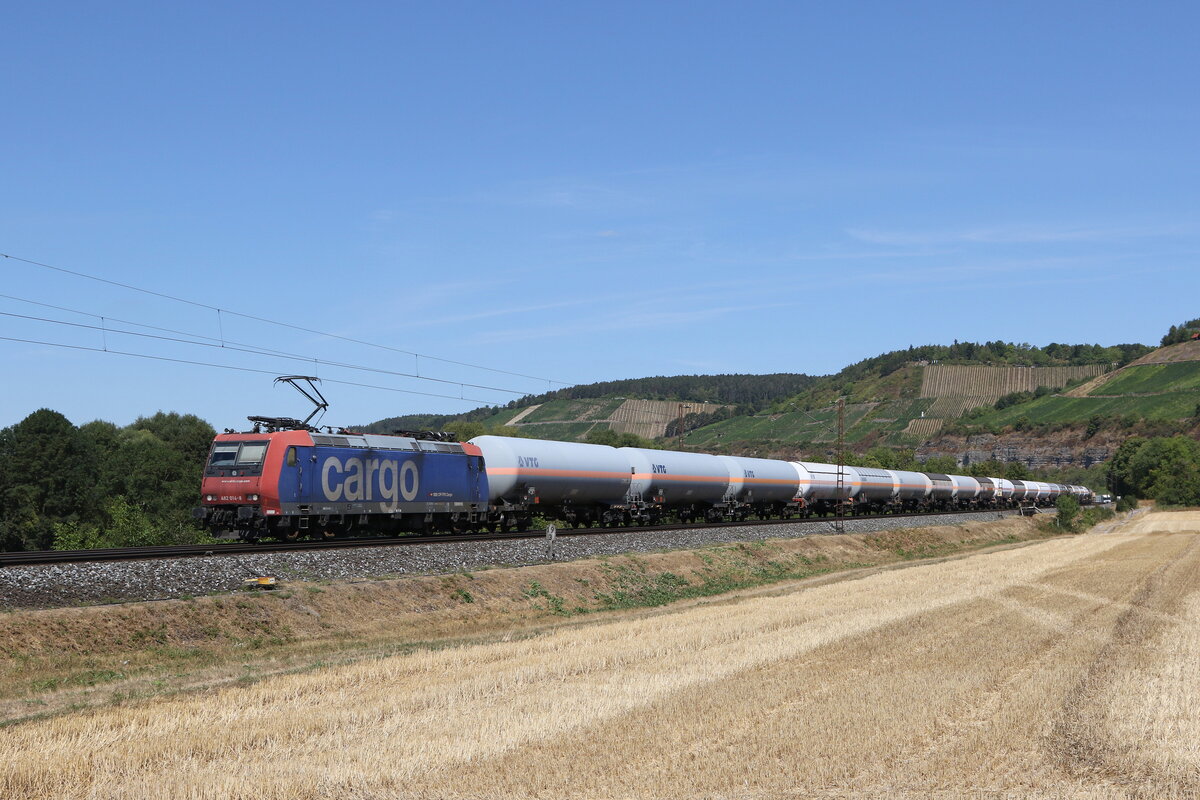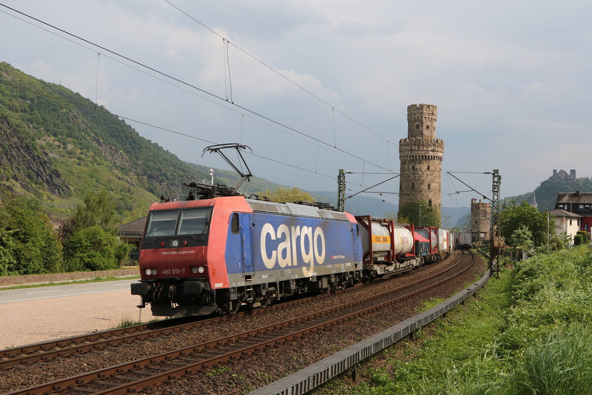 482 025 mit einem "KLV" bei der Einfahrt in Kaub am Rhein am 21. Juli 2021.