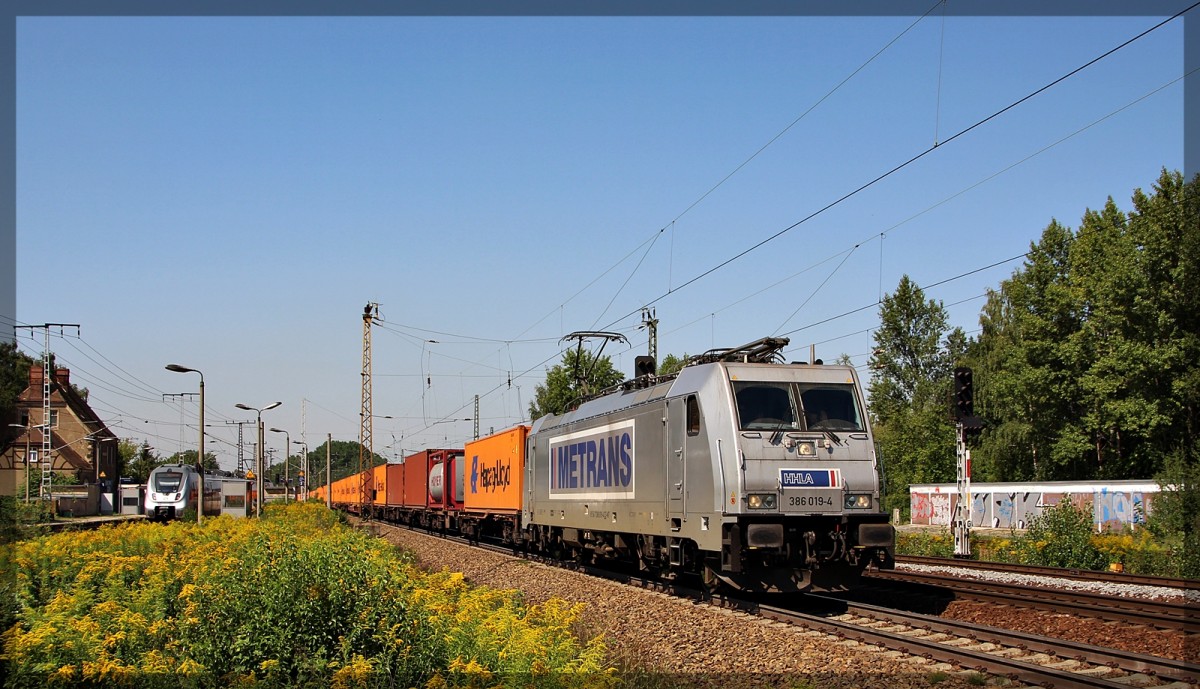 386 012 mit ihrem Zug in Richtung Hamburg bei der Durchfahrt von Hagenow-Land am 20.03.2016